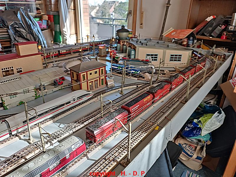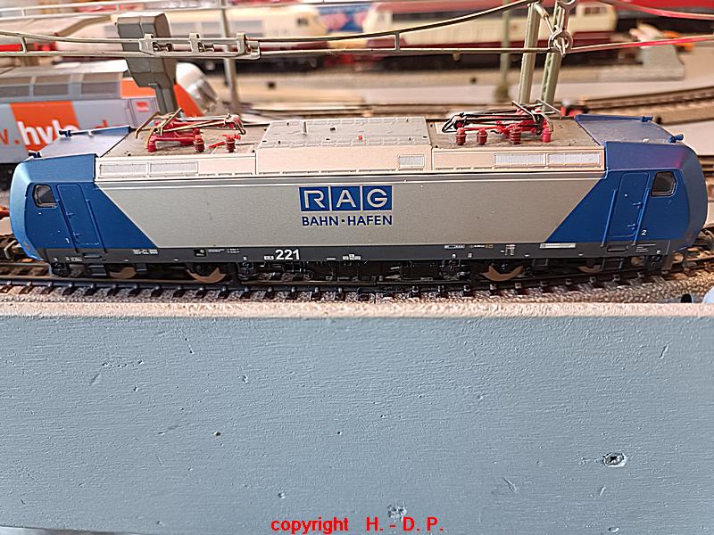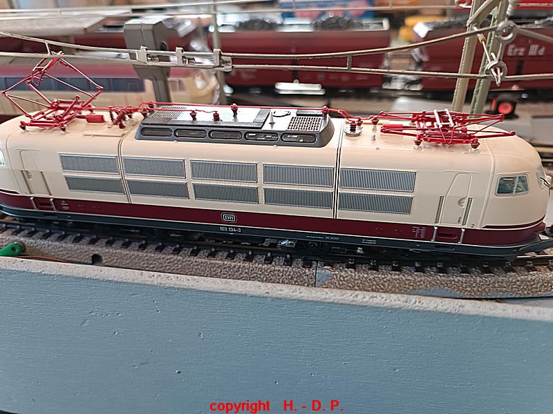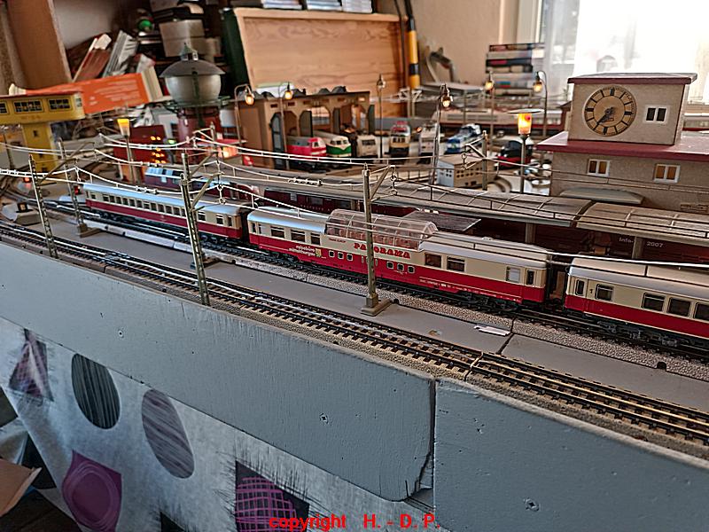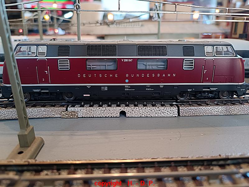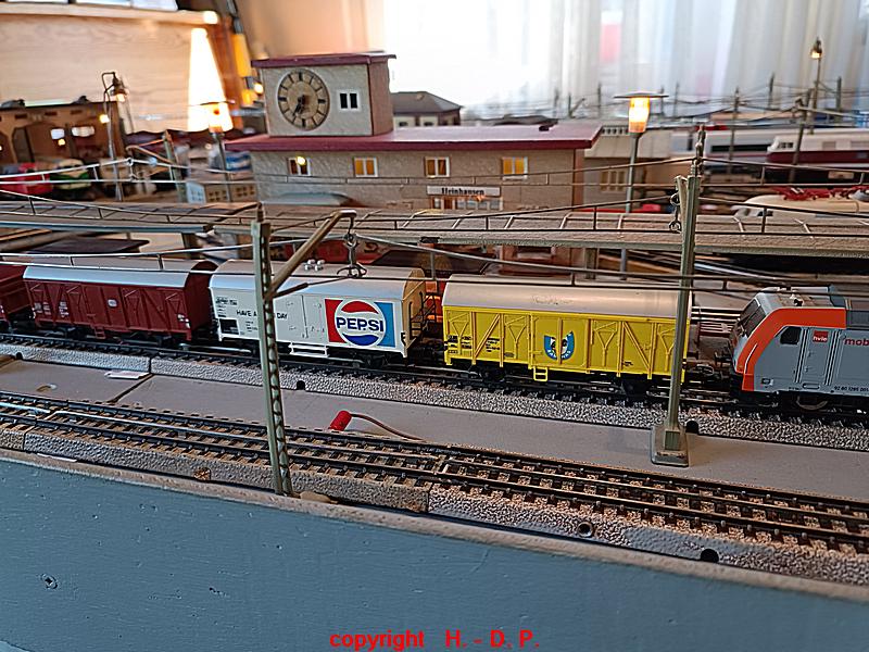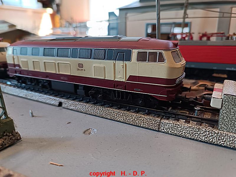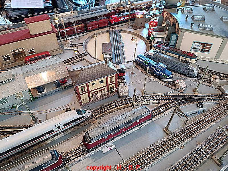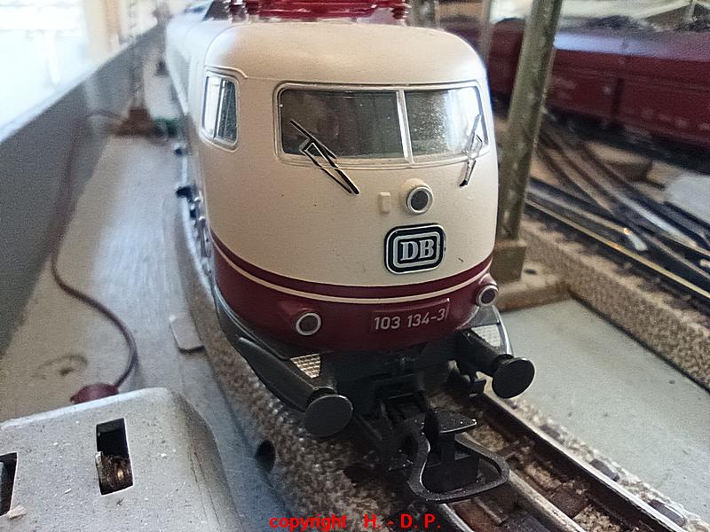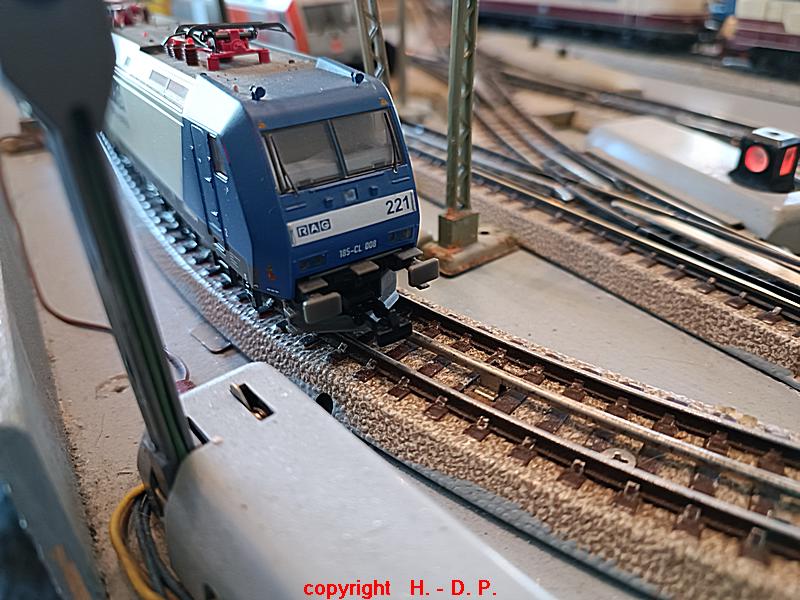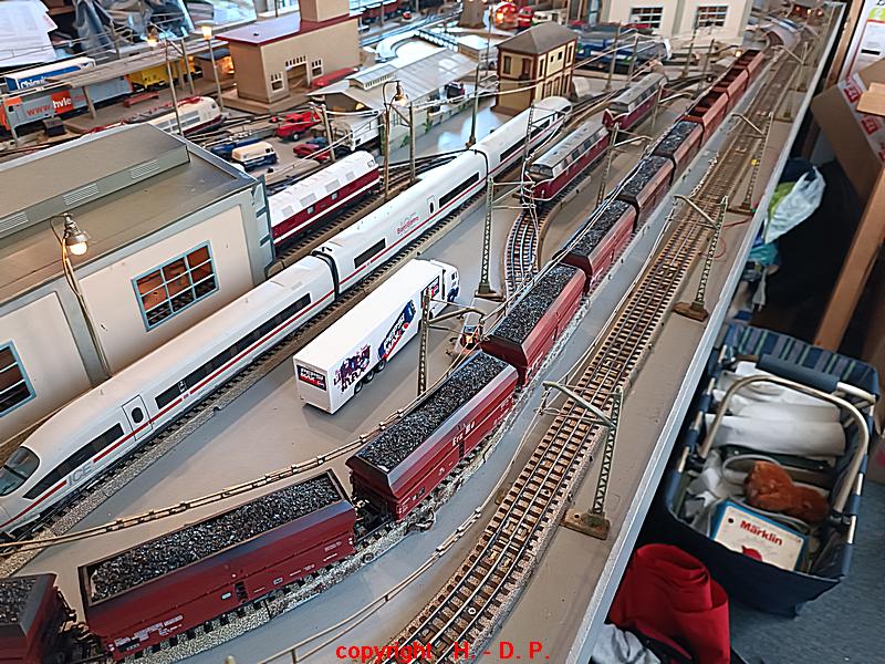 An den beiden nächsten Spieltagen kamen noch die Piko Loks auf die Gleise die bisher dort keinen Platz gefunden hatten und das waren 2 x V 200, 1 x BR 185 der RAG, eine Diesellok der hvle, 1 x BR 103 und 1 x BR 218 in TEE Farbgebung. Die BR 185 der HGK zog einen 10 Wagenzug mit Erzwagen, die BR 103 wurde vor einem TEE eingesetzt, die Diesellok der hvle vor einem gemischten Güterzug, die BR 281 zog einen TEE mit 3 Wagen, die BR 185 der RAG zog einen Containerzug und die beiden V 200 zogen am 4. Tag den 10 Wagen Erzzug. Leider konnte der ICE 3 nicht eingesetzt werden weil da eine Kardanwelle ausgehakt ist. Das Wagenmaterial stammte an den beiden Tagen aus Material der Firma Märklin, wobei die TEE Wagen aus den 27 cm Wagen bestand.