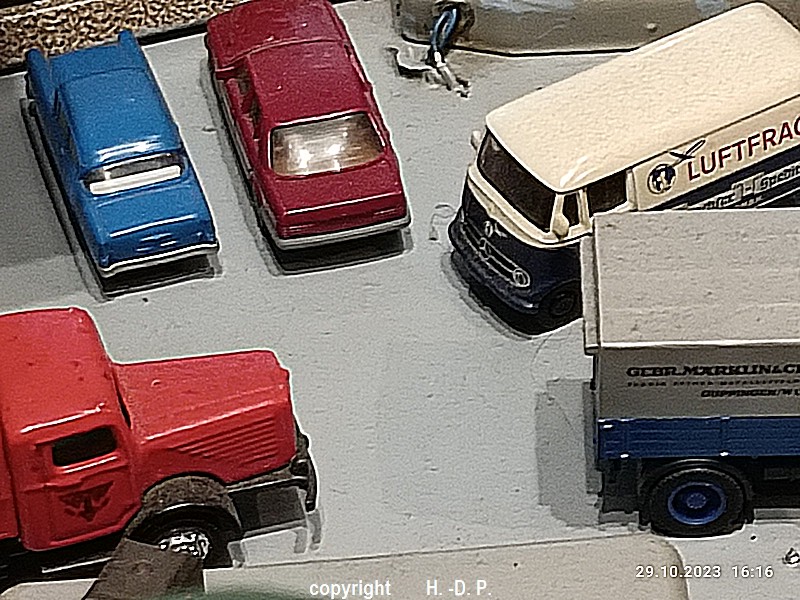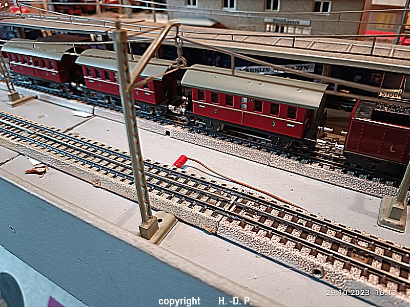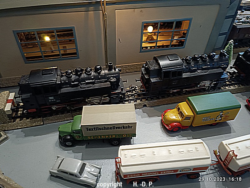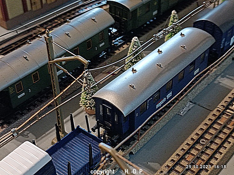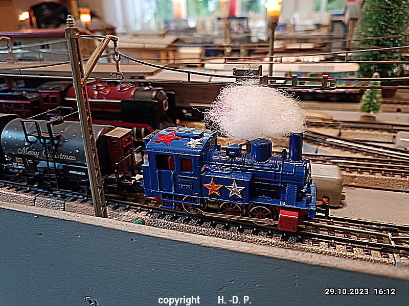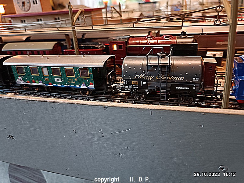 Der heutige Spieltag steht unter dem Motto "Allerlei im vorweihnachtlichen Heinhausen" Dazu habe ich mal einige Loks und Wagen au den Vitrinen, bzw. Stapelboxen genommen, die sonst nur selten bis fast gar nicht auf der Anlage zu sehen sind. Da dieser Spieltag ja schon in der Vorweihnachtszeit spielt, durfte natürlich auch die neue kleine umlackierte 3029, welche ich am letzten Freitag als Platzhalter für die neue Märklin Weihnachtslok von meinen MIST 47 Leuten erhalten habe, nicht fehlen. Ferner kamen noch zum Einsatz meine Märklin Magazin Wagen mit der Märklin Magazin Lok und später alle MM Wagen mit einer BR 50, die kleine Dampflok aus der Packung 0050 allerdings nicht in schwarz sondern in roter englischer Farbgebung als LMS Lok.