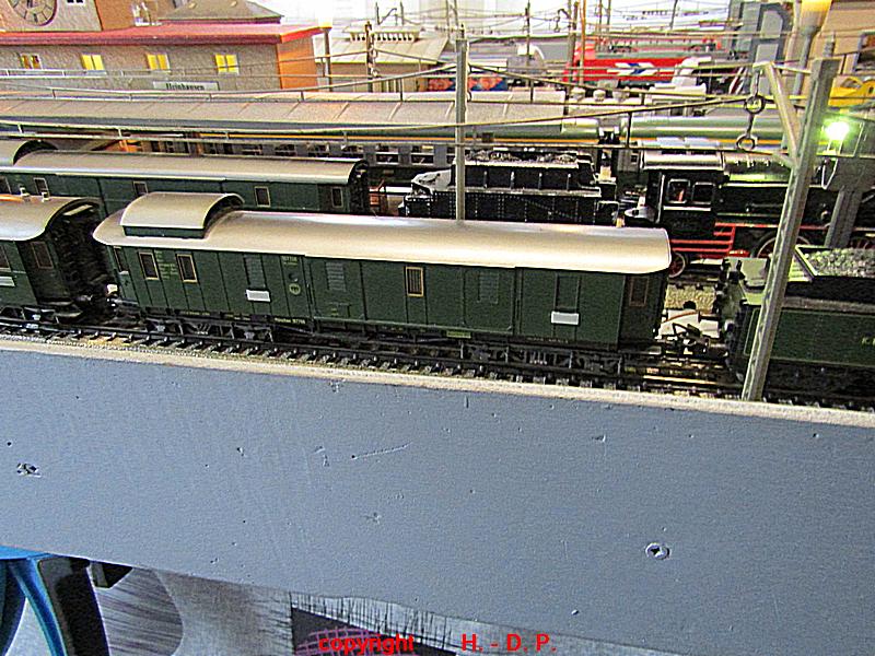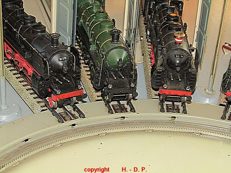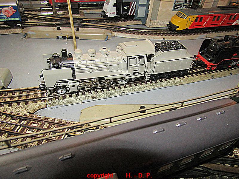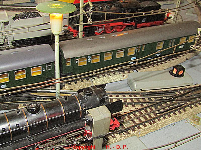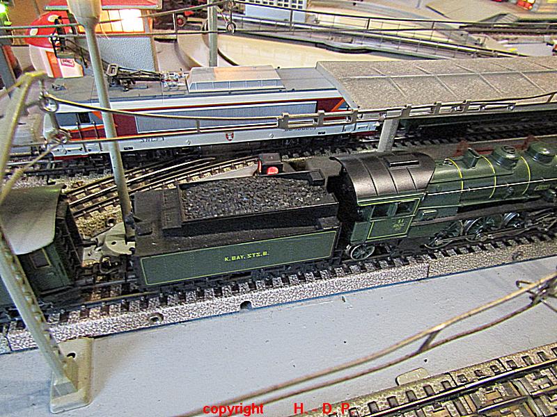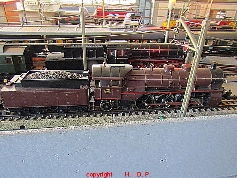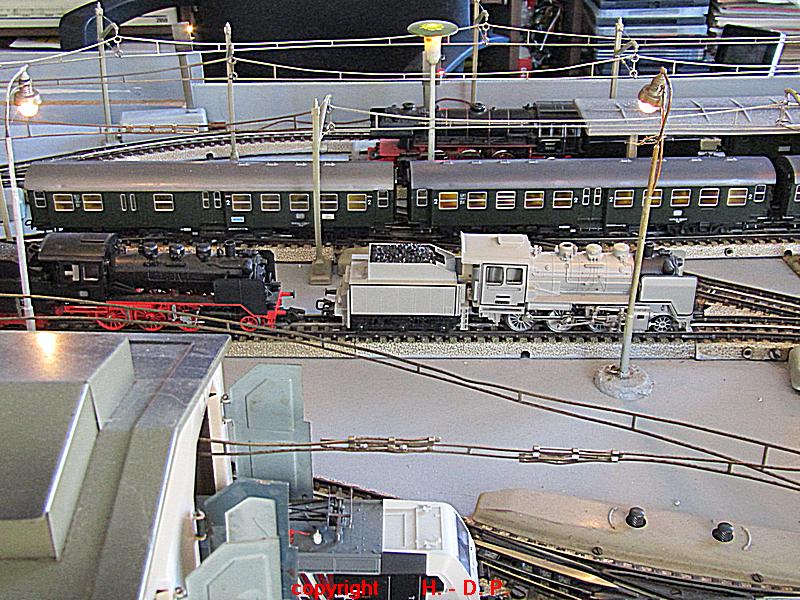 Mein Orientexpress wurde von der S 3/6 der SNBC gezogen und auch diese schöne Belgierin steht fast nur in der Vitrine und die sollte nun auch mal Auslauf erhalten. Weiter waren auf den Gleisen unterwegs eine V 200 mit Umbauwagen, ein Nachkriegs Eilzug mit BR 23, eine Französische E - lok mit Blechwagen der SNCF, ein Eilzug der DRG mit BR 01 HR 800 und ein Bayerischer Zug mit der grünen S 3/6. In den BW`s standen auch nur Loks die sekten zum Einsatz kommen, darunter auch einige moderne E - Loks.