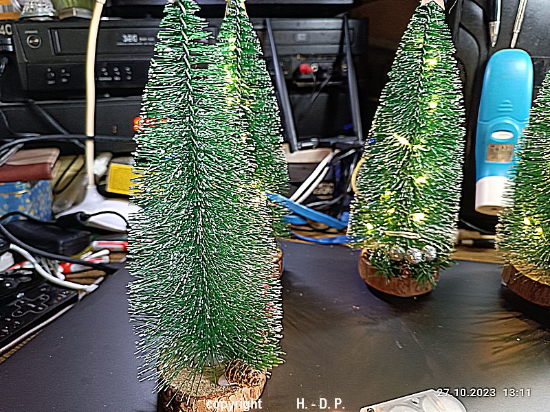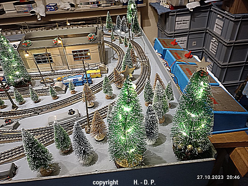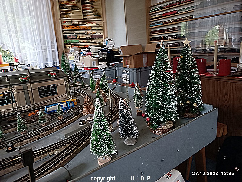 Die LED Ketten waren recht schnell an den 4 Tannen angebracht und dann wurden die mit vielen anderen Deko Tannen auf die Anlage gestellt.