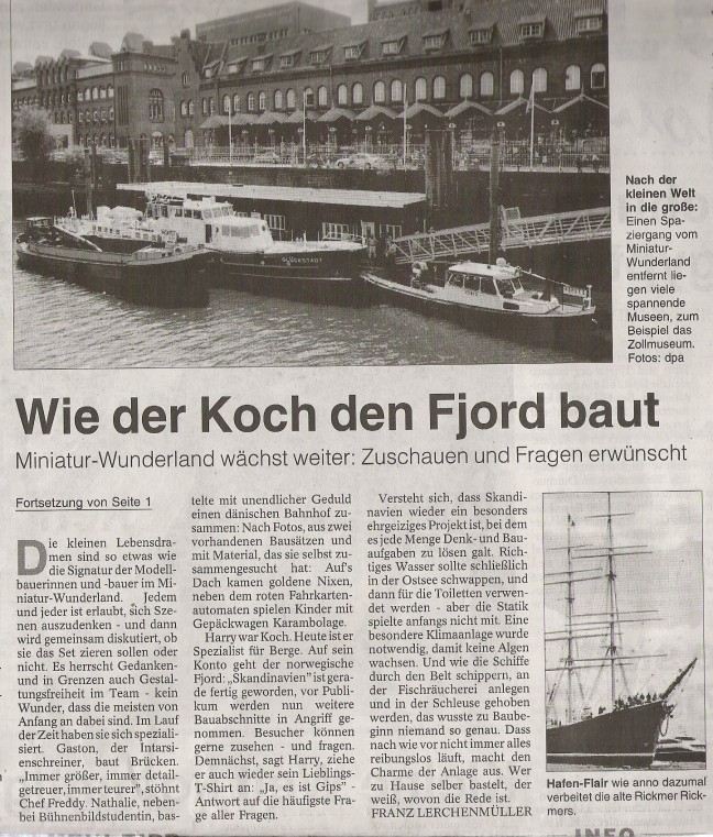 Heute, am 27.07.2005, war in der Tageszeitung NRZ = Neue Ruhr Zeitung in der Mittwochsbeilage REISE JOURNAL ein Bericht über das Miniatur Wunderland in Hamburg. Diesen Bericht möchte ich natürlich allen Freunden der kleinen Bahn nicht vorenthalten. Ich hoffe es ist noch lesbar.