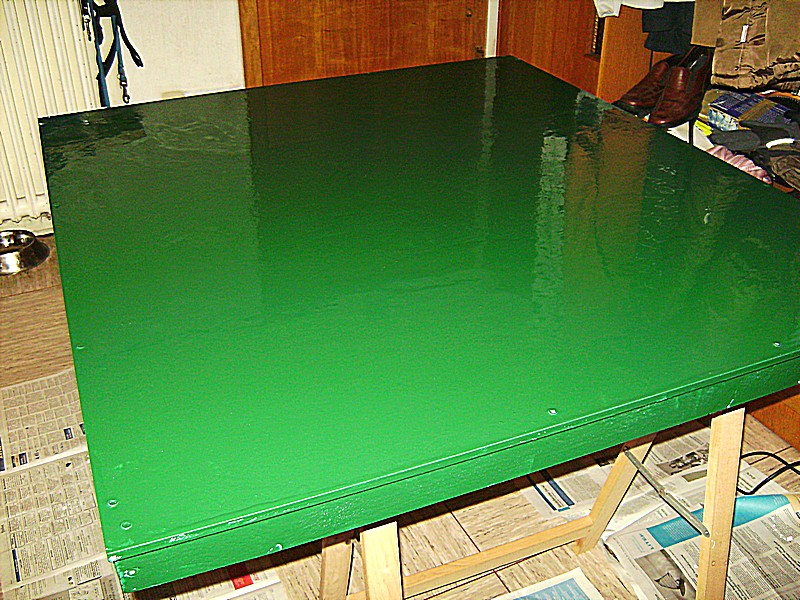 Ich habe die Platten ganz bewußt grün gestrichen, weil auf der alten Platte wo die Grasmatte drauf war es immer Ringe gab, weil Getränke drauf gestellt wurden. Diese Ringe kann ich jetzt abwaschen.