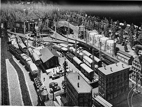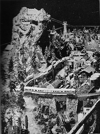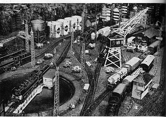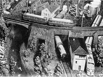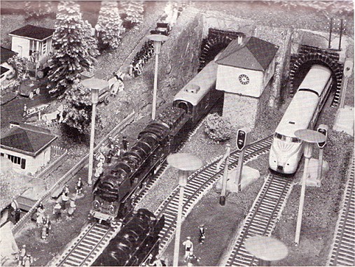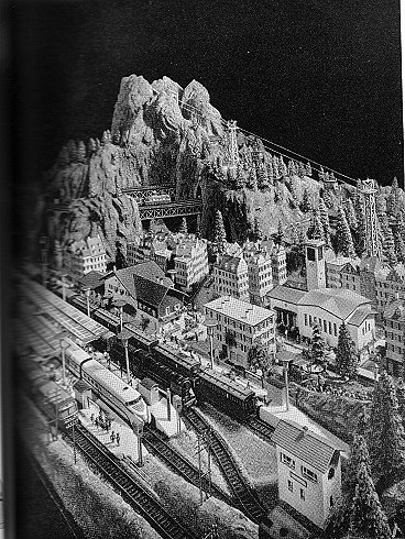 Auf dieser Seite möchte ich Ihnen eine Anlage vorstellen, wie es sie heute nicht mehr gibt. Die MÄRKLIN Anlage von Otto Hübchen habe ich selber als Kind im Jahr 1958 in Duisburg vor Weihnachten dass erste Mal erlebt. Diese Bahn hat mich derartig fasziniert, dass mein größter Weihnachtswunsch 1958 eine MÄRKLIN Bahn war. Ich bekam in dem Jahr eine Anfangspackung mit einer V 200 und 3 D.-Zugwagen. Gleichzeitig bekam ich noch ein Paar elektrische Weichen einige Schienen, den Faller Bahnhof Schönblick, den Eheim Fernsehturm und die Kirche aus dem Engardin mit Glockengeläut in einer frei schwingenden Glocke.