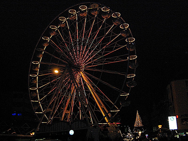 Also beginnt mein Bericht auf der Münzstraße,   bei C & A wo eine Kinder Autobahn und einige "Fressbuden" standen. Die Weihnachtsbeleuchtung allerdings ist gewöhnungsbedürftig. Die Münzstraße war schwarz vor Menschen und wir hatten alle Mühe da durch zu kommen. Ab Kuhtor begann der Weihnachtsmarkt mit einem sehr großen  Riesenrad  und eine "Fress-  und Saufbude" nach der anderen.  Man konnte dort von der 1/2 Meter Rostbratwurst, über Reibekuchen, Backfisch usw. sich richtig satt essen. Ich dachte schon das mal wieder ein Weihnachtsmarkt ohne Weihnachtssachen sei aber da hatte ich mich doch getäuscht. Es gab sogar reichlich Stände die Weihnachtssachen verkauften.