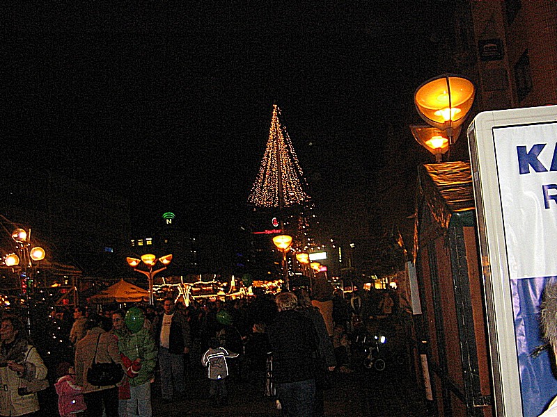 unter dem Weihnachtsbaum die ersten Buden mit Blick auf Peek & Cloppenburg
