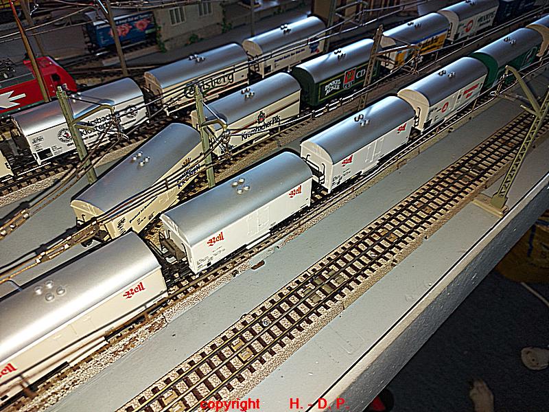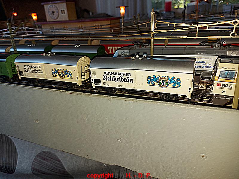 54 dieser Bierwagen stammen von Märklin und 2 von Fleischmann und die Loks stammen von Mehano, Märklin und Piko