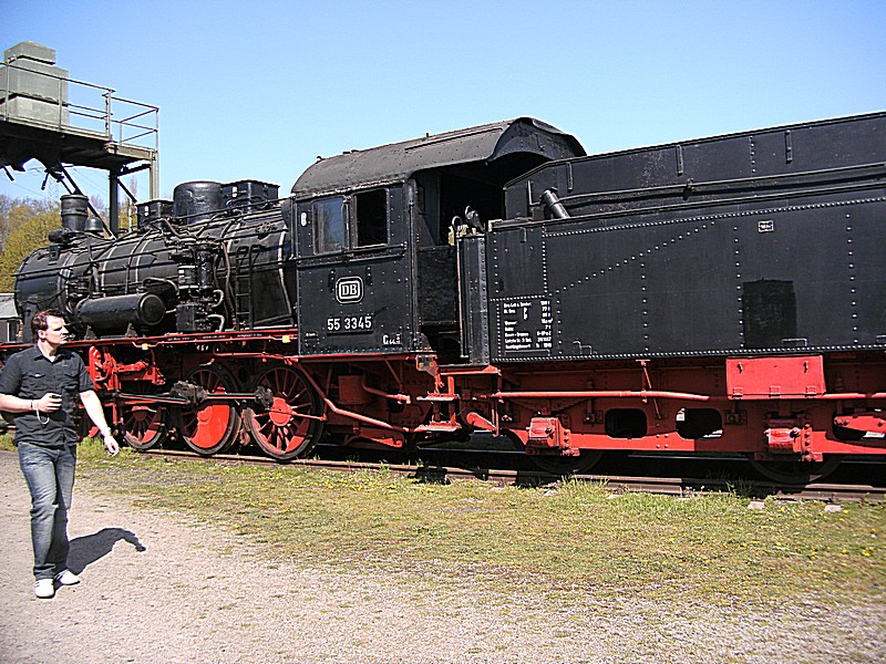 Leider hatte ich mich viel zu warm angezogen, denn als ich losgefahren bin hatten wir draußen gerade einmal 5 Grad plus, also habe ich eine dicke Steppjacke angezogen, die natürlich später bei 23 Grad viel zu warm war. Ich habe geschwitzt wie ein Affe. Zuerst habe ich die Loks vor dem Lokschuppen besichtigt, denn es war ja ein Preußen Tag angekündigt. Der Preußen Zug der Eisenbahnfreunde aus Witten machte heute Pendeldienst zwischen dem Museum und Bochum Hbf. Immer wenn dieser Zug angekommen war gab es eine Durchsage das e in 10 Minuten wieder abfahren würde. Ich war dann leider immer genau am anderen Ende des Geländes. Also im Schweinsgalopp, was bei mir dann die Geschwindigkeit einer Schnecke im Rückwärtsgang bedeutet, zurück zum Museums Bahnsteig und wenn ich dann endlich angekommen war, mit raushängender Zunge, war der Preußen Zug schon wieder weg. 3 x habe ich das Spiel mitgemacht, dann habe ich mir gedacht Du kannst mich mal. Aus diesem Grund gibt es leider keine Bilder von diesen wunderschönen Zug. Aber ich habe ein kleines Video davon bei der ersten Einfahrt gemach.