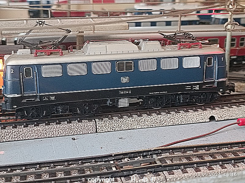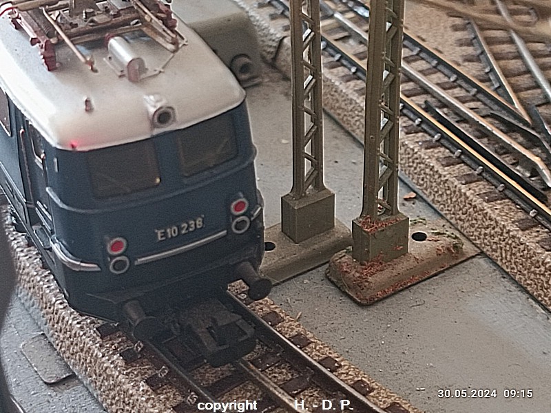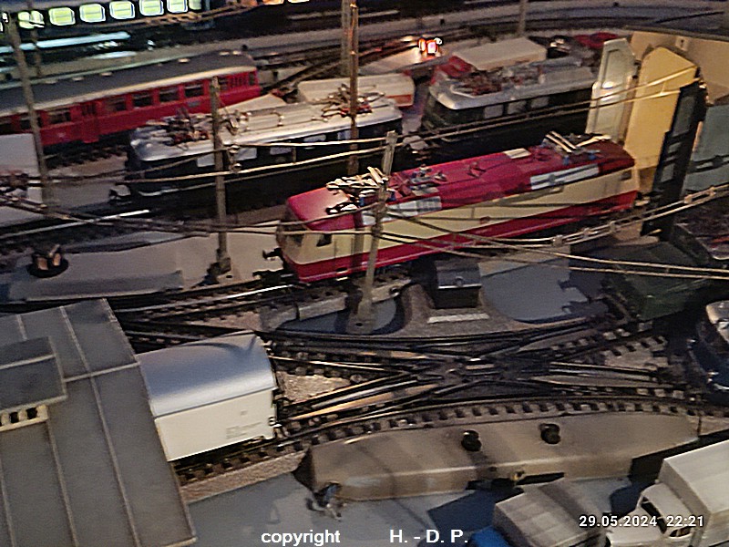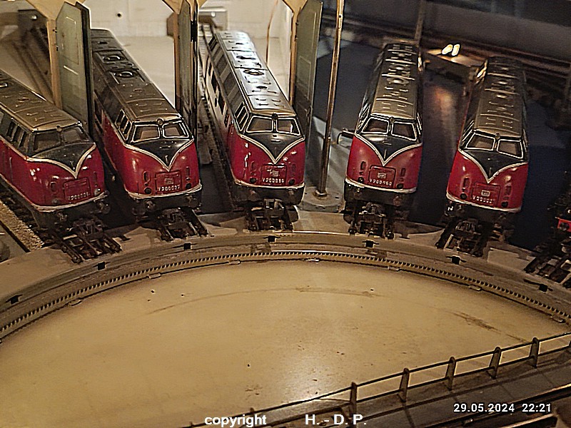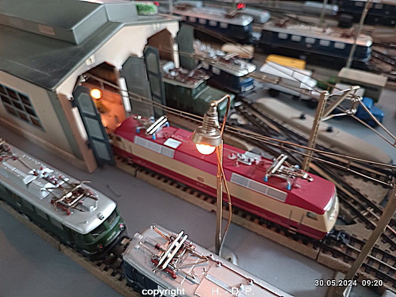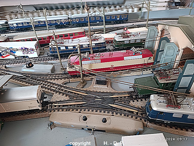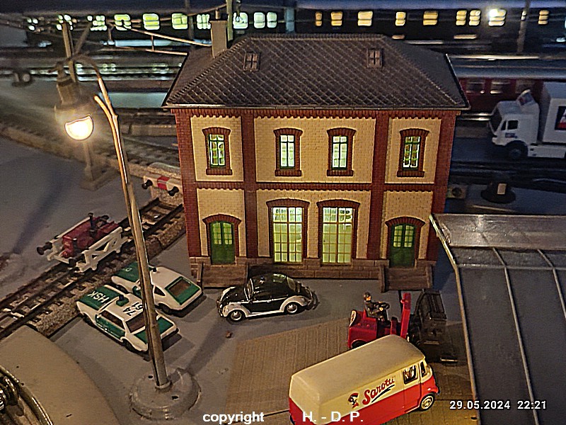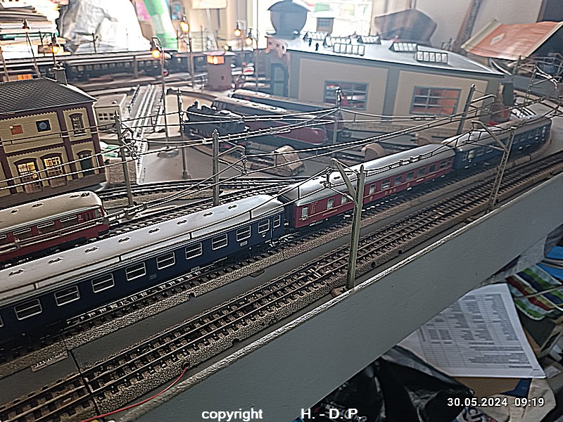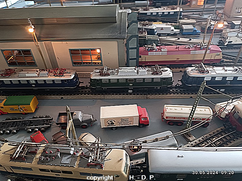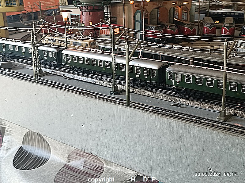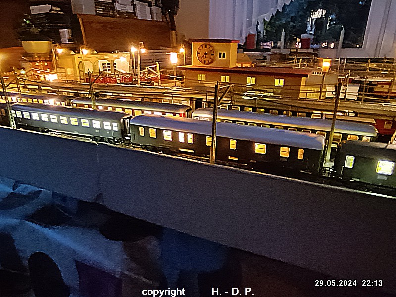 Der heutige Spieltag steht unter dem Motto "Heinhausen bei Tag und Nacht" Alle Loks und Wagen stammen aus dem Haus Märklin und die D-Zugwagen sind beleuchtete 24 cm Blechwagen, teilweise mit LED Birnchen in der Beleuchtungseinrichtung 7077.