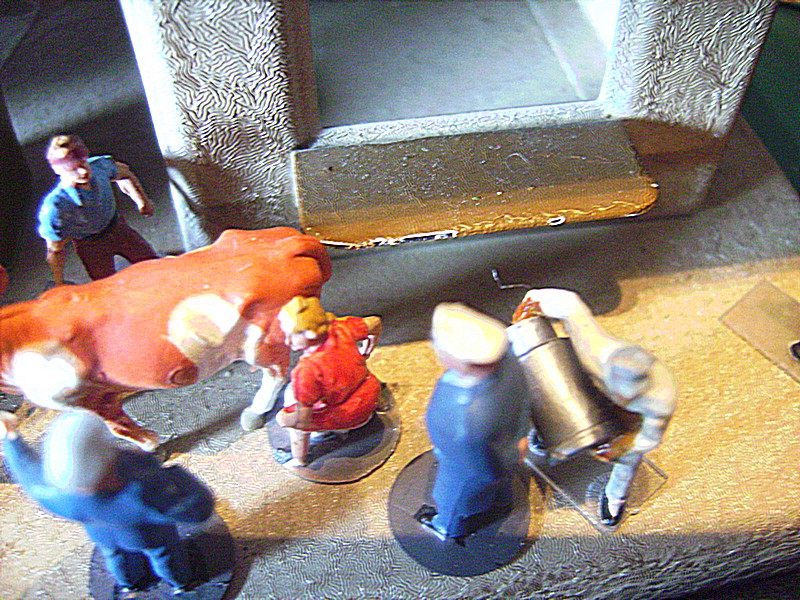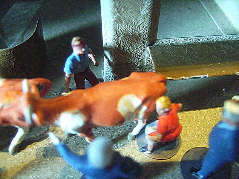 Oma und Opa Lustig saßen auf der Bank und schauten dem lustigen Treiben zu. Herr Peters hatte seinen Sohn Peter auf die Schulter genommen, damit er nicht unter die Hufe kam, während die Stallhelfer Gustav Knute und Freddy Besen die Hinterlassenschaft der Kühe beseitigten, denn man wollte den Bahnhof ja sauber halten. Erich Milchkanne dagegen schleppe eine Kanne nach der anderen ans Gleis und kippe die Milch dort aus.