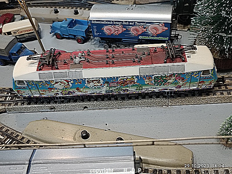 Dazu kam noch der kleine Kittel Dampftriebwagen mit 3 Güterwagen der Fleischindustrie und eine Lok der BR EP 2 der DRG mit neuen Donnerbüchsen aus der 4100 Serie. Alle Loks und Wagen stammen aus dem Haus Märklin. Diese Züge drehten ihre Runden im bereits heute vorweihnachtlich geschmückten Heinhausen.