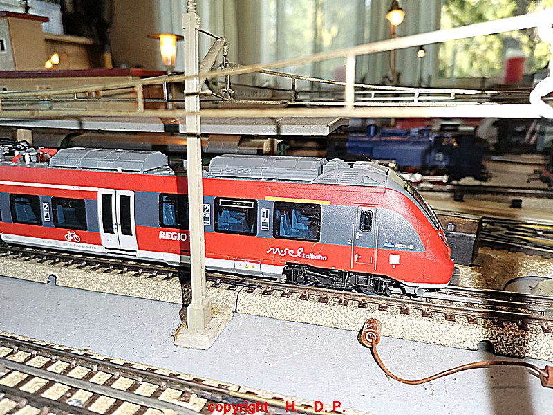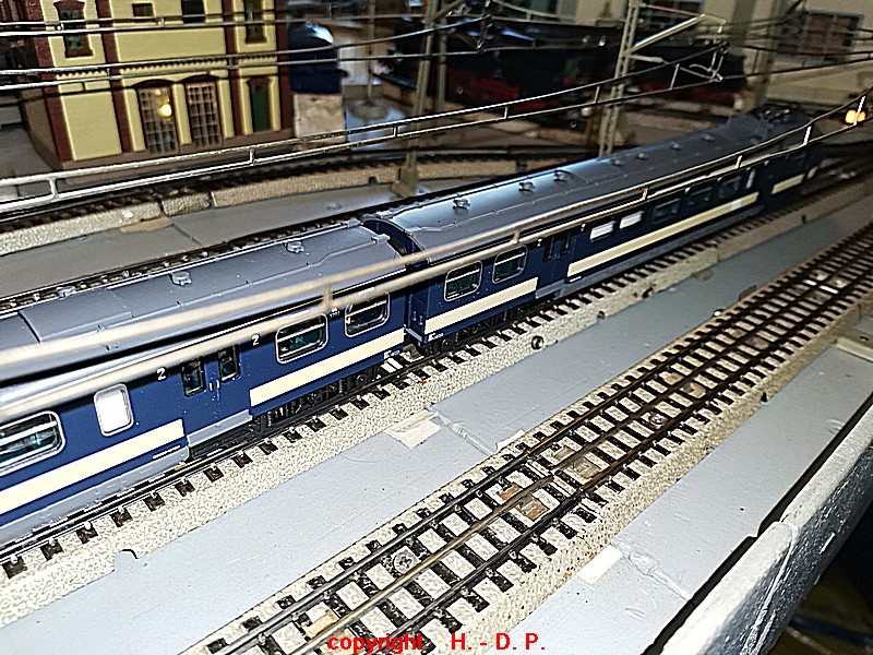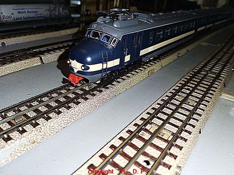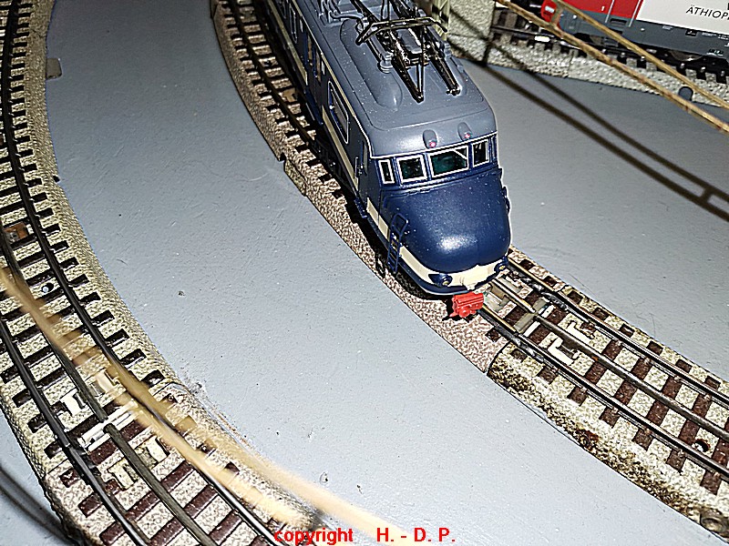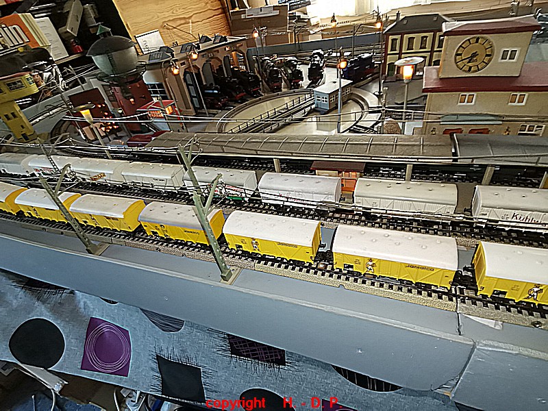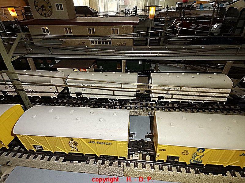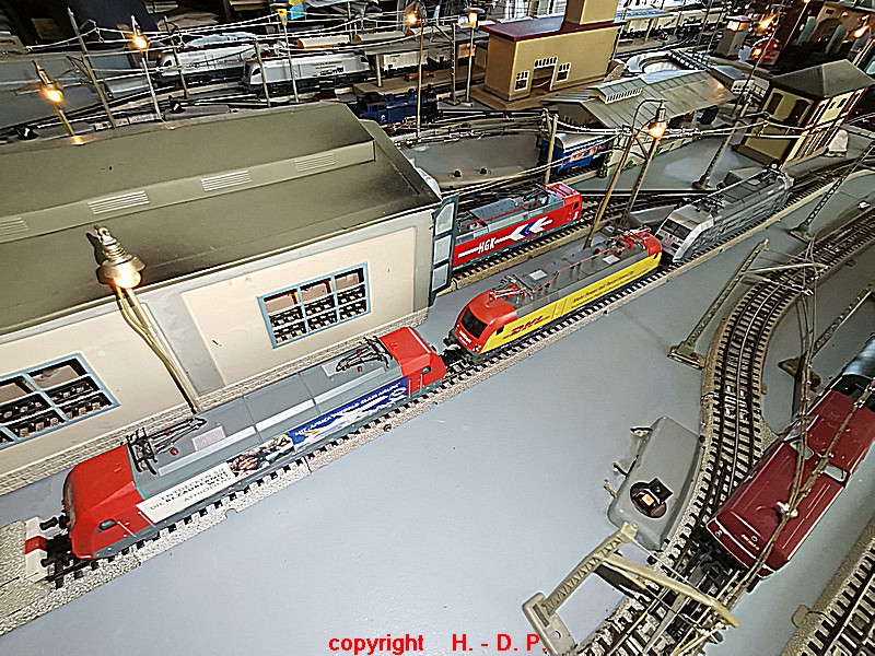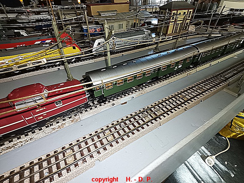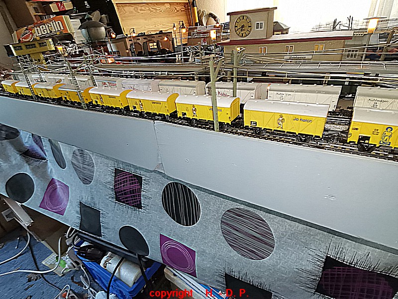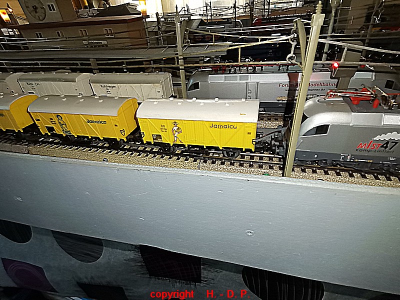 da waren auf der Anlage unterwegs ein Kühlwagen Zug gezogen von einem Piko Taurus, ein Bananenwagen Zug gezogen auch von einem Piko Taurus und die Wagen beider Züge haben sich gefruet über die poko Lok und die haben nicht die Nase gerümpft so wie einige andere Leute. Als Eilzug war auch noch der Märklin "Bamberger" der Zugpackung 26541