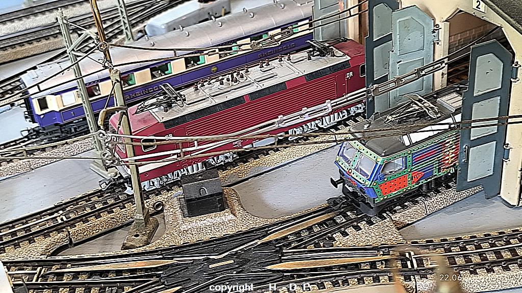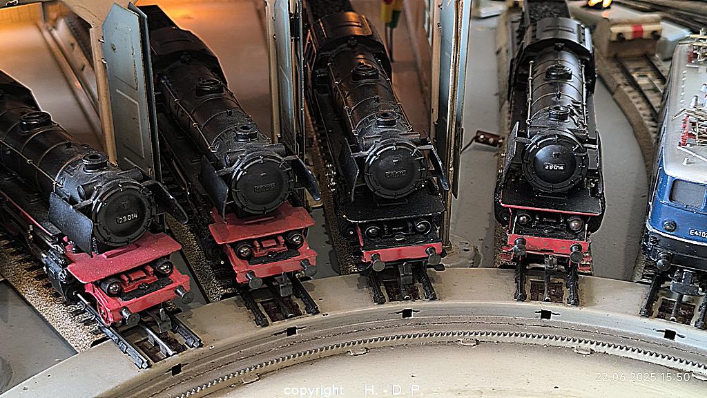 In den Lokschuppen und auf den Abstellgleisen gab es noch 4 x Märklin BR 23 , 1 x Märklin BR E 10, 1 x Märklin V 100,  1 x Piko TEE BR 103, 1 x TEE Märklin BR 103, 1 x TEE Märklin BR  E 10, 1 x Märklin Baukasten Lok der SBB und eine E  - Lok der DR zu sehen.
