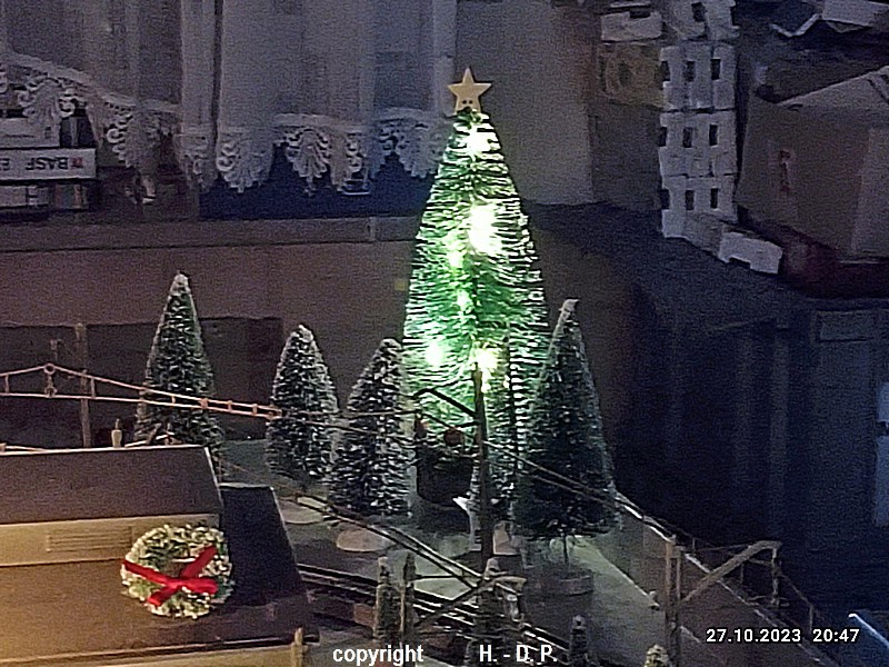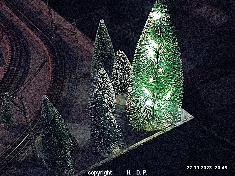Die LED Ketten waren recht schnell an den 4 Tannen angebracht und dann wurden die mit vielen anderen Deko Tannen auf die Anlage gestellt.