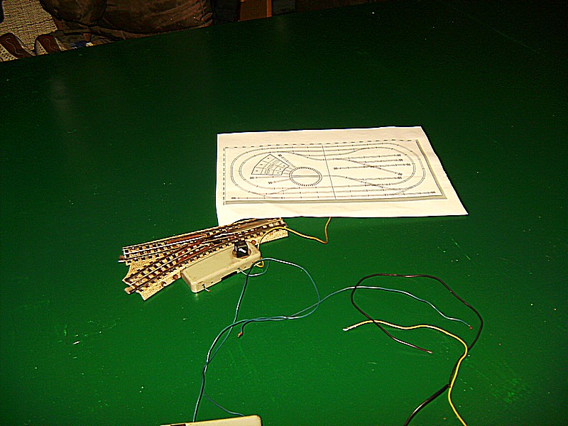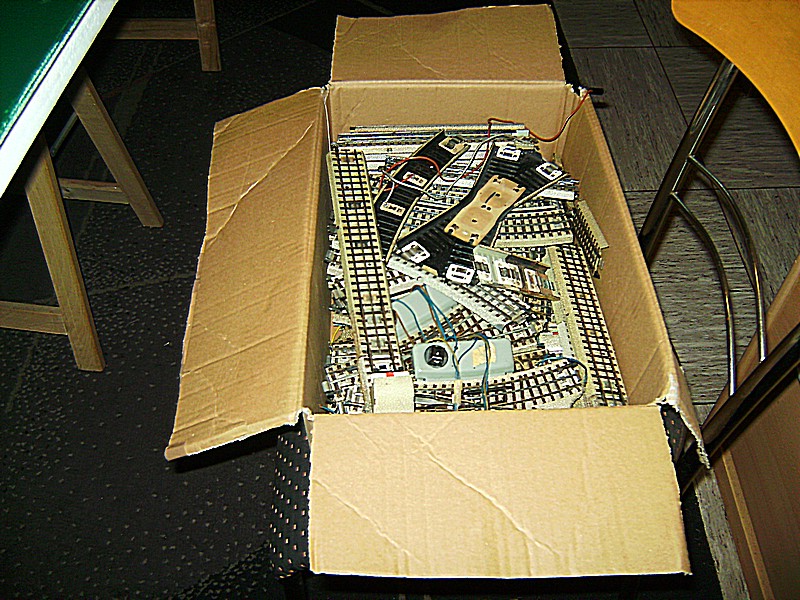 Nachdem nun die Platte trocken ist, habe ich beide auf mein Bock/Lattengerüst gestellt und habe erneut die Anlage aufgebaut. Nach dem Aufbau kam die Probefahrt, zum Glück, denn es gab einen Kurzen. Wo kam der also her ??denn an der Lok konnte es nicht liegen die hatte ich gar nicht drauf. Es ist eine ganz alte Angewohnheit von mir, bevor eine Lok auf das alte M - Gleis kommt erst einmal den Regler auf zu drehen um zu sehen ob es einen Kurzen gibt oder nicht. . Doch die Sucherei macht keinen Spaß, weil ich von dem Anschlußgleis aus jedes einzelne Gleis überprüft werden muß. Ich war fast hanz rum als ich den Fehler gefunden  hatte. Eine Verbindungslasche des Mittelleiters war verbogen, also gerichtet und siehe da es ging.