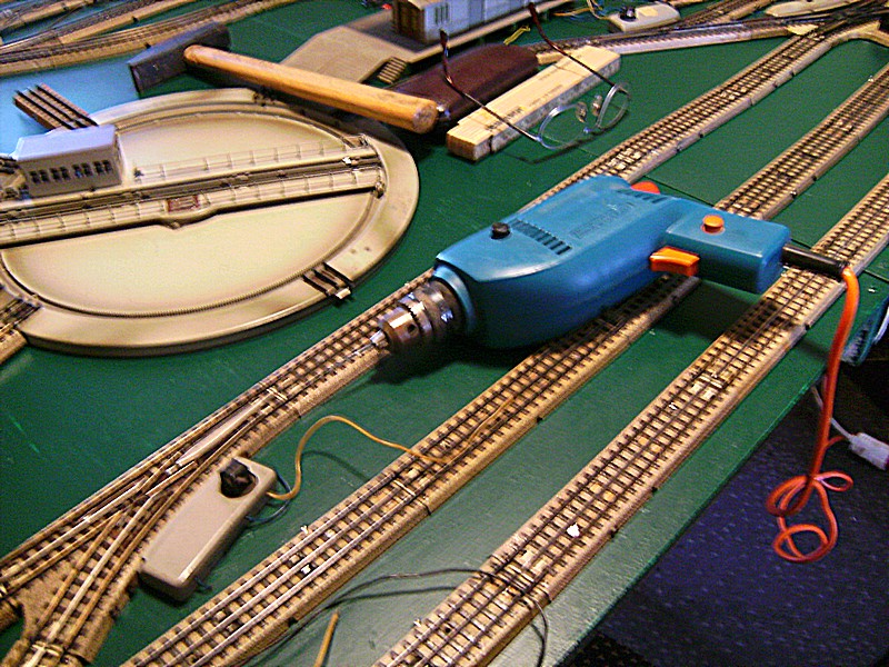 So jetzt ist ein großer Teil geschafft, Die Schienen der beiden Kreise sind verschraubt, ebenfalls die Drehscheibe und die dazugehörigen Gleise. Noch nicht verschraubt sind die Gleise der Abstellgruppe, weil da noch an einigen Schienen ein Kabel angelötet werden muß und Kabel muß ich auch noch besorgen. Wenn das geschehen ist, werden die Platten geteilt und die Mittelleiter Verbindungen an den Schienen der Plattenkante werden entfernt. Auch muß noch alles verkabelt werden, was noch einige Tage dauern wird.