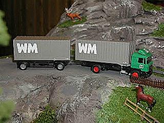 Dieser LKW ist Funkferngesteuert und wird über eine Fernbedienung gefahren. Der Anhänger kann über die Fernbedienung abgekuppelt werden. Maßstab 1:87