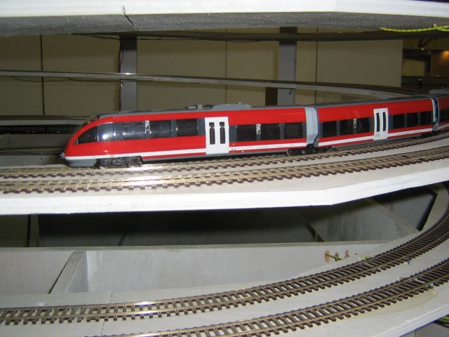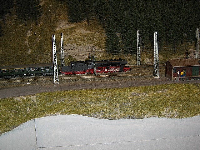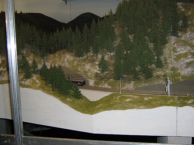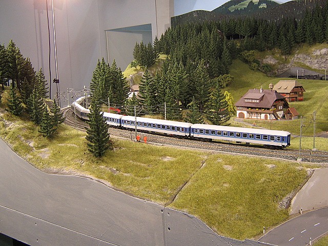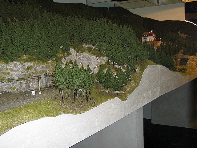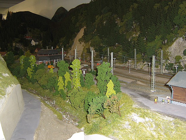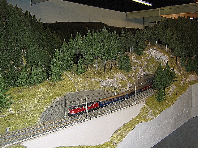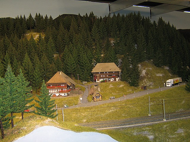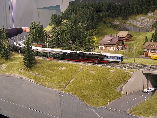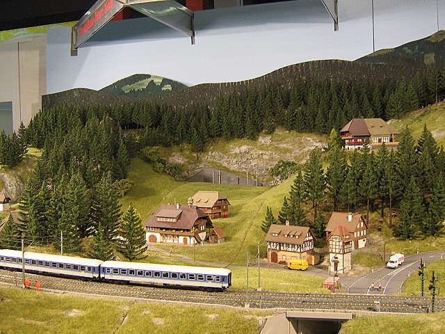 Und weiter geht der Rundgang mit , nach meiner Meinung , besten Anlage der Intermodellbau 2006, der Schwarzwaldbahn vom Modellbau Team Köln. Diese Anlage sagt mehr als tausend Worte, weniger ist mehr. So findet man bei dieser Anlage überwiegend Landschaft. Einige tausend Tannen wurden gesetzt. Der eigentliche Bahnbetrieb ist in den Hintergrund gerückt, die Landschaft steht im Vordergrund.