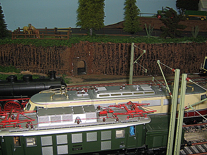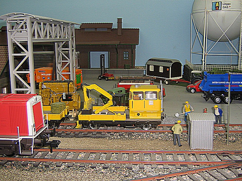 Zu sehen gab es 2 große Anlagen, eine in Spur 1 und eine in Spur HO. Wobei man sagen muß das beide Anlagen noch nicht fertig sind, so fehlt bei der Spur 1 Anlage noch die Oberleitung, nur die Maste stehen bereits. Fangen wir mit der Spur 1 Anlage einmal an.