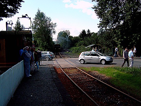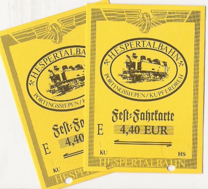 Laut Preisaushang an dieser Bude sollte die Hin - und Rückfahrt 3,30 € kosten aber auf den Karten stand 4,40 € drauf. Der Witz an der Sache war, das an einem Baum neben der Bude ein Zettel mit dem richtigen Preis stand. Ich habe natürlich den höheren Preis gezahlt, schon wegen der guten Sache, aber in Ordnung fand ich das nicht. Der erste Zug sollte laut Plan an diesem Tag um 12:40 Uhr den Bahnhof verlassen, aber wir waren gerade eingestiegen als die Leute der Hespertalbahn sehr hecktisch wurden. Der Zug muß aus dem Bahnhof hörte ich jemanden schreien und dann das bekannte "Alles einsteigen, die Türen schließen, der Zug fährt ab" und das alles 30 Minuten früher.