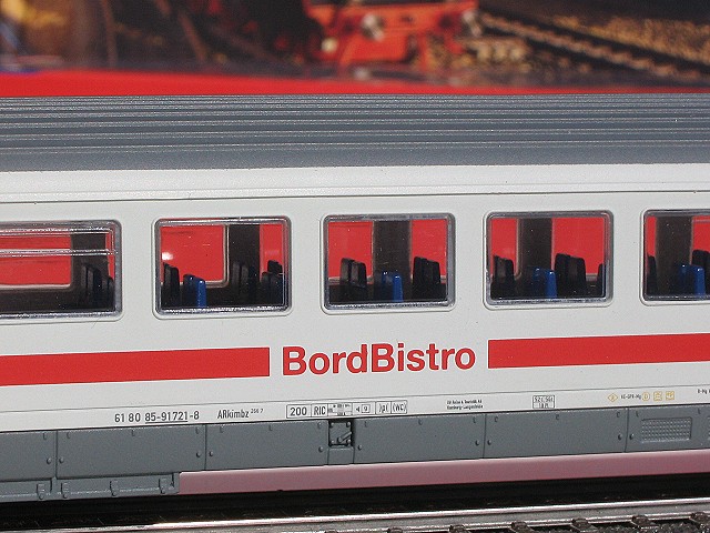 Die Inneneinrichtung des Bord Bistro Wagens ist gleich mit denen der 1. und 2. Klasse, was wohl so nicht stimmen kann, denn auf meiner Hamburg Fahrt war ein IC Bistro Wageen dabei und da waren keine Sitzbänke drin sondern 2 Theken und vieeeeel Platz in der Mitte des Wagens zum tanzen oder auch nur rumstehen.