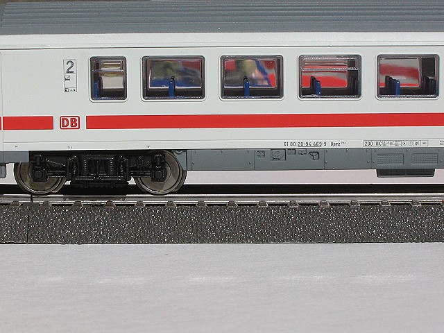 Da ich keine geeignete Zuglok in verkehrsrot habe, außer der BR 1985, mußte meine alte BR 120 in ihrer alten Farbgebung herhalten für diesen Test. Der Zug fuhr in allen Geschwindigkeitsbereichen sehr gut über alle Weichen und ist nicht einmal entgleist. Auf den ersten Blick waren die Wagen alle sehr ordentlich verarbeitet mit einer sehr feinen Beschriftung, doch bei genauerem Hinsehen sind selbst mir, einem der das Vorbild nicht genau kennt, einige Dinge aufgefallen.