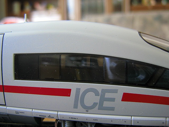 Jetzt ist er da der ICE 3 der Firma Piko. Heute morgen brachte die Post das lang ersehnte Paket mit dem ICE 3. Natürlich wurde er sofort ausgepackt und in Augenschein genommen. Leider mußte ich mich mit einem Schienenoval auf dem Wohnzimmertisch begnügen, aber für einen ersten Test reichte das voll und ganz. Der Zug sieht einfach nur klasse aus. Die Stromführende Kupplung rastet sehr leicht ein und läßt sich genau so leicht wieder lösen. Der Motor sitzt im Bordbistro Wagen durch dessen Scheiben man trotzdem noch durchsehen kann. Der Antrieb geht auf je eine Achse der beiden Drehgestelle und die Räder haben Haftreifen, was für eine gute Haftung sorgt. Nicht sehr gut gelößt finde ich die Faltenbälge, die bei Kurvenfahrt sehr weit, zu weit ??, auseinander stehen. Auch der Panto macht nicht gerade den stabilsten Eindruck, er schein fast der selbe zu sein wie bei allen Piko Hobby Loks.