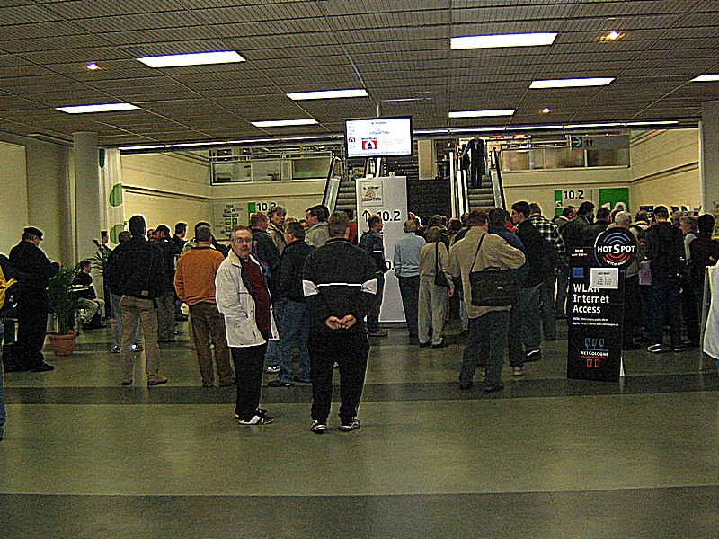 Gegen 7:30 fuhren meine Frau und ich schon los, da es wie sau schüttete und man aus diesem Grund die ca. 80 KM nicht mit Vollgas fahren konnte. Gegen 8:30, also nach genau einer Stunde - sonst brauche ich genau 45 Minuten - waren wir vor der Messe und wollten auf das Dach der Messe fahren zum parken. Aber das ging diesesmal leider nicht wir mußten einen Parkplatz nehmen der nach Aussage der Ordnungskräfte ca. 6 Minuten weg war. Ich war schon sauer, denn ein Fußweg von 6 Minuten für "normale" Menschen bedeutet für mich ca. 15 Minuten und genau so war es auch genau 14 Minuten sind wir gelaufen. Meine Frau meinte so beiläufig " ich schlafe fast beim gehen ein" was mir nur einige Flüche entlockte. Ich habe nun einmal verkehrt eingehängte Beine und das Laufen fällt mir verdammt schwer. Dazu kam noch der Wind und der sehr starke Regen es war nicht sehr schön.