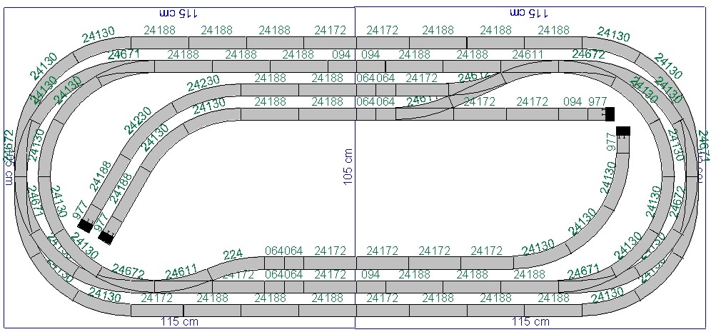 Bei unserem letzten Mist 47 hatte es bei unserer Spielbahn leider einen Kurzschluß gegeben, den wir leider erst nach über einer Stunde gefunden hatten. Dieser Kurzschluß war genau an der Stelle wo immer eine Schiene eingesetzt werden mußte. Zum besseren Verständnis sei gesagt, das ich zwei Platten von 1,10 x 1,03 m gebaut hatte wo aber die Schienen nicht genau an der Kante endeten, so das immer 8 Schienen eingesetzt werden mußten, siehe unteren Plan