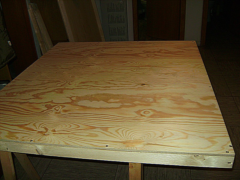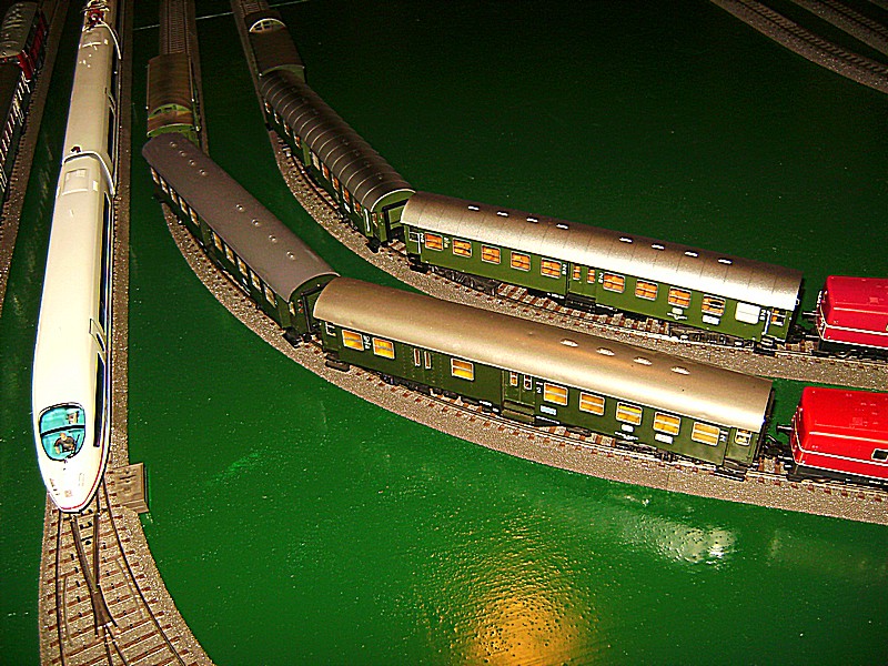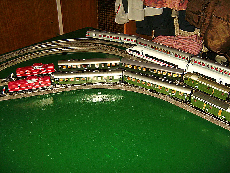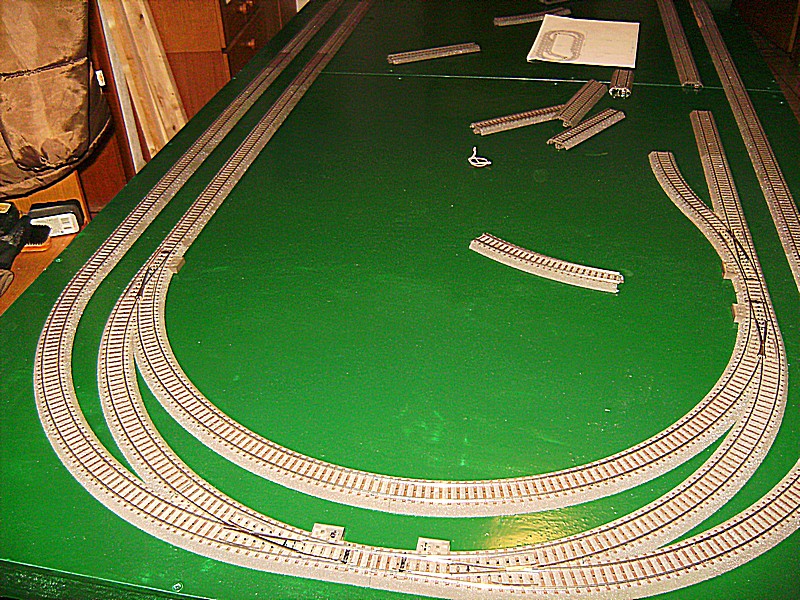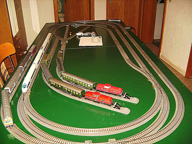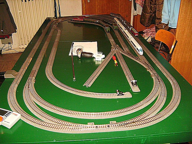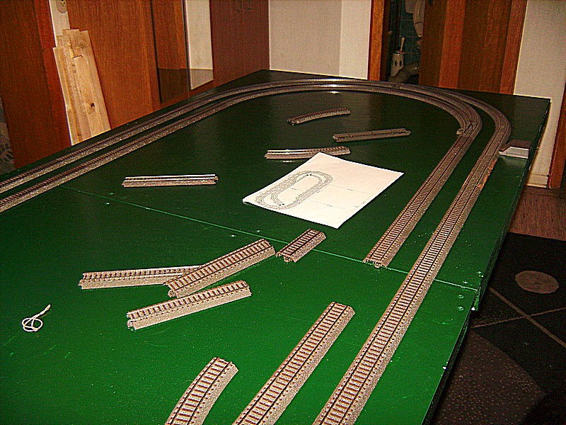 Zum Glück waren nur wenige Schienen nicht mehr zu gebrauchen, bei einigen gab es auch nur ein größeres Loch drin, so das die noch mit eingebaut werden konnten. Ich habe nur noch ein Paar Bogenweichen, ein Paar normale Weichen und einige Ausgleichsstücke kaufen müssen, was aber auch ca. 90 € gekostet hat. Dazu kamen noch 70 € für Holz. Dieses mal habe ich 10 mm Sperrholz genommen und nicht wieder 20mm Spanplatte, die sauschwer war. Die Spanplatten wurden auf Dachlatten geschraubt und geleimt, so das es einen guten Halt gibt. Noch habe ich keine Weichenantriebe eingebaut also muß die Anlage bei unserem nächsten Stammtisch mit der Hand geschaltet werden. Der einzige Unterschied zu dem Plan ist eine normale Weiche 24611, die ich nicht hatte, die durch eine Dreiwegeweiche ersetzt wurde. Es gibt jetzt also noch ein kleines Abstellgleis mehr.