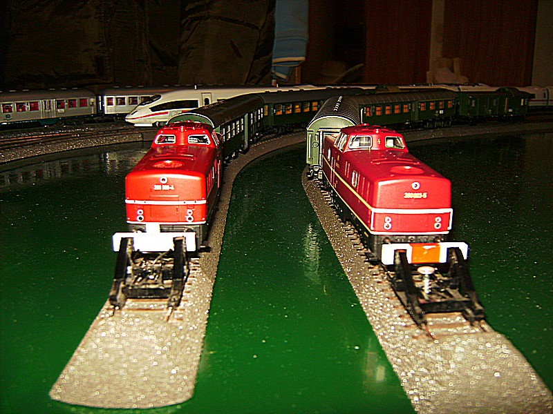 Ja, ich weiß das die Trennlinie nicht genau in der Mitte ist. Als wir den Kurzschluß festgestellt hatten meldeten sich einige Leute die ein "Ticken" in einem Weichenantrieb gehört haben wollten, was aber unmöglich war. Denn die Weichen wurden analog geschaltet mit einem eigenen Trafo und das konnte den Kurzschluß im digitalen Bereich nicht ausgelöst haben, aber auf mich hörte ja keiner. Es wurden nun die Schrauben gelöst, was aber mit dem vorhandenen Werkzeug nicht so ganz einfach war, also wurde es mit Gewalt gemacht, so das die Schraubenköpfe in der Platte blieben und die Schienen ein häßliches Loch bekamen. Ich habe mich dabei zurückgehalten denn sonst wäre ich geplatzt. Selbst die Weichenantriebe wurden nicht abgeschraubt sondern einfach die Kabel rausgerissen.