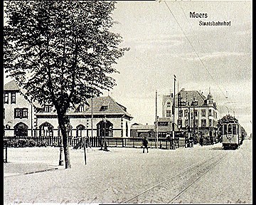 Die alte Grafenstadt und ehemalige Kreisstadt Moers   erhielt erst im Jahre 1904, mit der Eröffnung der Strecke Duisburg - Kleve, ihren Bahnanschluß. Aus dieser Zeit stammt auch der heute noch erhaltene Bahnhof, der aber früher ebenerdig angelegt war mit einem Bahnübergang an der Hombergerstraße. Der Grund für diese Bahnstrecke war, die Arbeiter schneller an die Arbeitsplätze zu bringen.