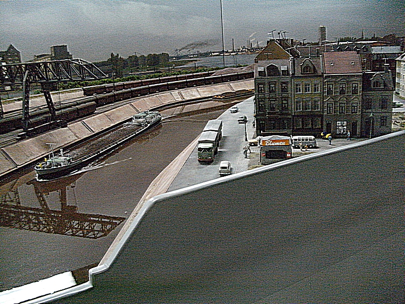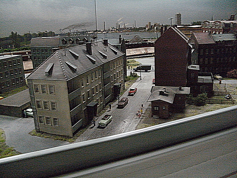 Die Tag / Nachtsteuerung funktionierte heute auch sehr gut, leider blieben beim Nachtbetrieb sehr viele Häuser stock dunkel, ja ganze Stadtteile waren ohne Licht, nur die Straßenbeleuchtung brannte. Auch daran muß noch gearbeitet werden, denn das alte Ruhrgebiet war immer hell beleuchtet. Die Faller Car Autos waren auch nur sehr spärlich unterwegs, es fehlt da nach meiner Meinung der , auch schon in den 60er Jahren, dichte Straßenverkehr. Dagegen wurde die Preiserlein Bevölkerung deutlich aufgestockt, aber es sind immer noch viel zu wenige auf der großen Anlage zu sehen. Was mir besonders aufgefallen ist, das es einige bewegte Figuren zu sehen gab, was besonders die Kinder fast zu Freudenschreien veranlaßte. Diese kleinen Hingucker machen eine Anlage erst so liebenswert und das ist den Machern der MWO sehr gut gelungen. Auch bei den Fabrikanlagen hat sich einiges getan, so werde ich versuchen die alten Bilder als Vergleich unter die neuen zu stellen, falls der Standpunkt ähnlich ist.
