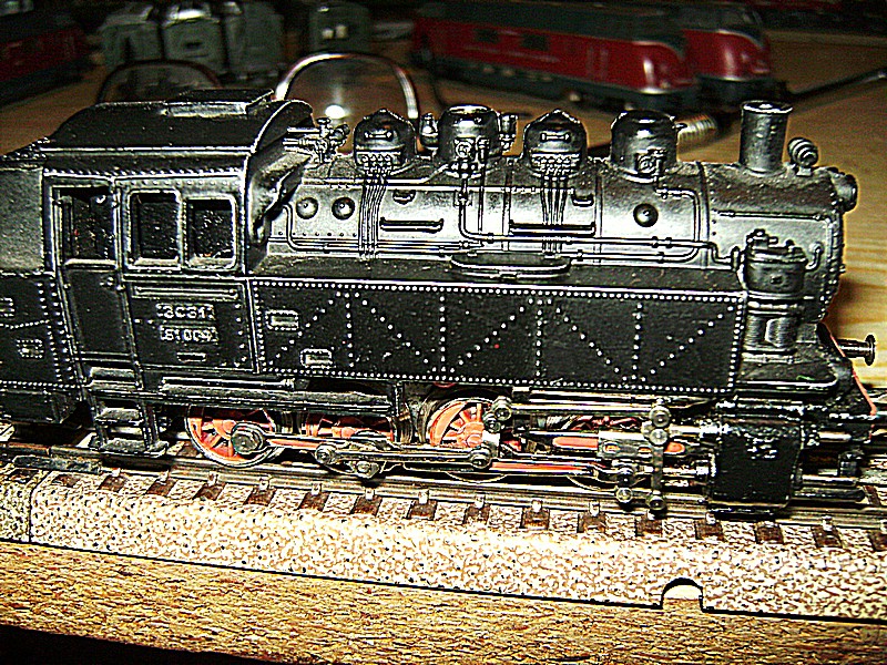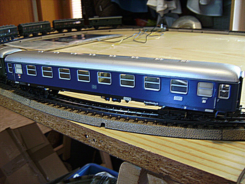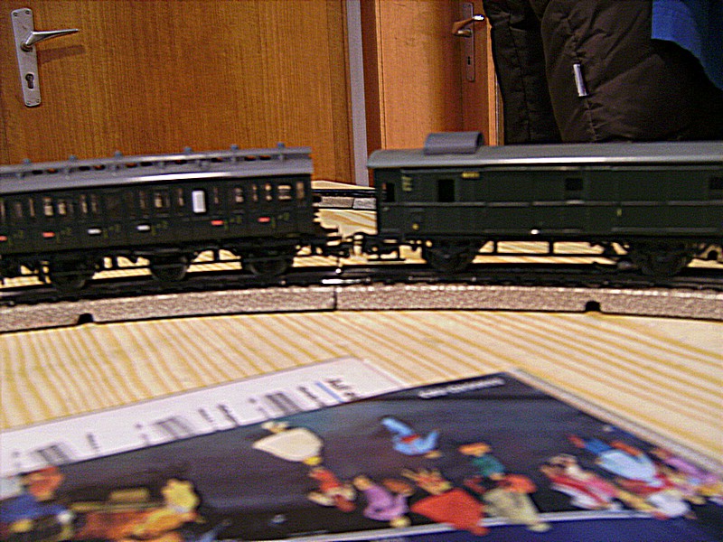 Soviel zur Zukunft, denn ich habe noch nicht alle Schienen zusammen, es fehlen noch Prellböcke und Ausgleichsstücke. Im Moment habe ich nur eine kleine , schmale Platte in meiner Diele stehen mit einem Oval mit 2 geraden Schienen und zwei Weichen, aber es rattert sehr schön.