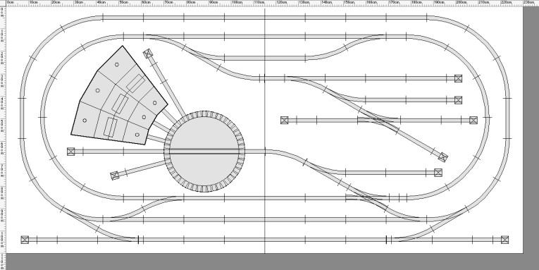 Dieser Plan ist typisch für die damalige Zeit und hat alles was das Blechbahner Herz erfreut. Lokschuppen, Drehscheibe und Abstellgleise sind vorhanden, genau so wie ein zweites Gleis um einen weiteren Zug einsetzen zu können. Leider hat dieser schöne Plan für mich einen großen Nachteil. Ich muß diese Anlage so bauen, das ich sie teilen kann, denn sie muß in den Kofferraum meines Opel Astra Caravan passen und da ist die größte Länge 1,50 m. Da ich diese Anlage auf 2,30 m Länge bauen möchte, benötige ich 2 Platten a. jeweils 1,15 und da müssen die Schienenkanten genau an der Schnittkante enden, denn ich will und werde kein Gleis zersägen. Leider bekomme ich das mit dem oben abgebildeten Plan nicht hin.